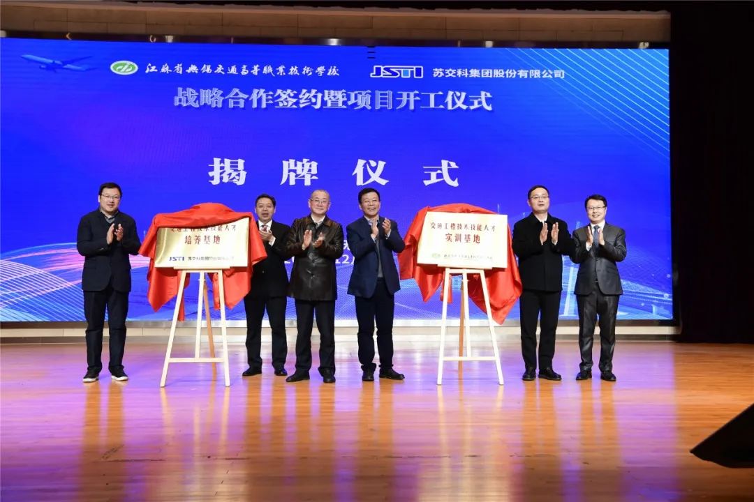 金凌副厅长、夏成满书记、朱晓宁总裁、李虎书记、俞刚局长、惠恭健副局长共同见证战略合作协议的签订,共同为“苏交科集团交通工程技术技能人才培养基地”和“江苏省无锡交通高等职业技术学校技术技能人才实训基地”揭牌,并启动生产性交通工程试验检测中心项目开工仪式。