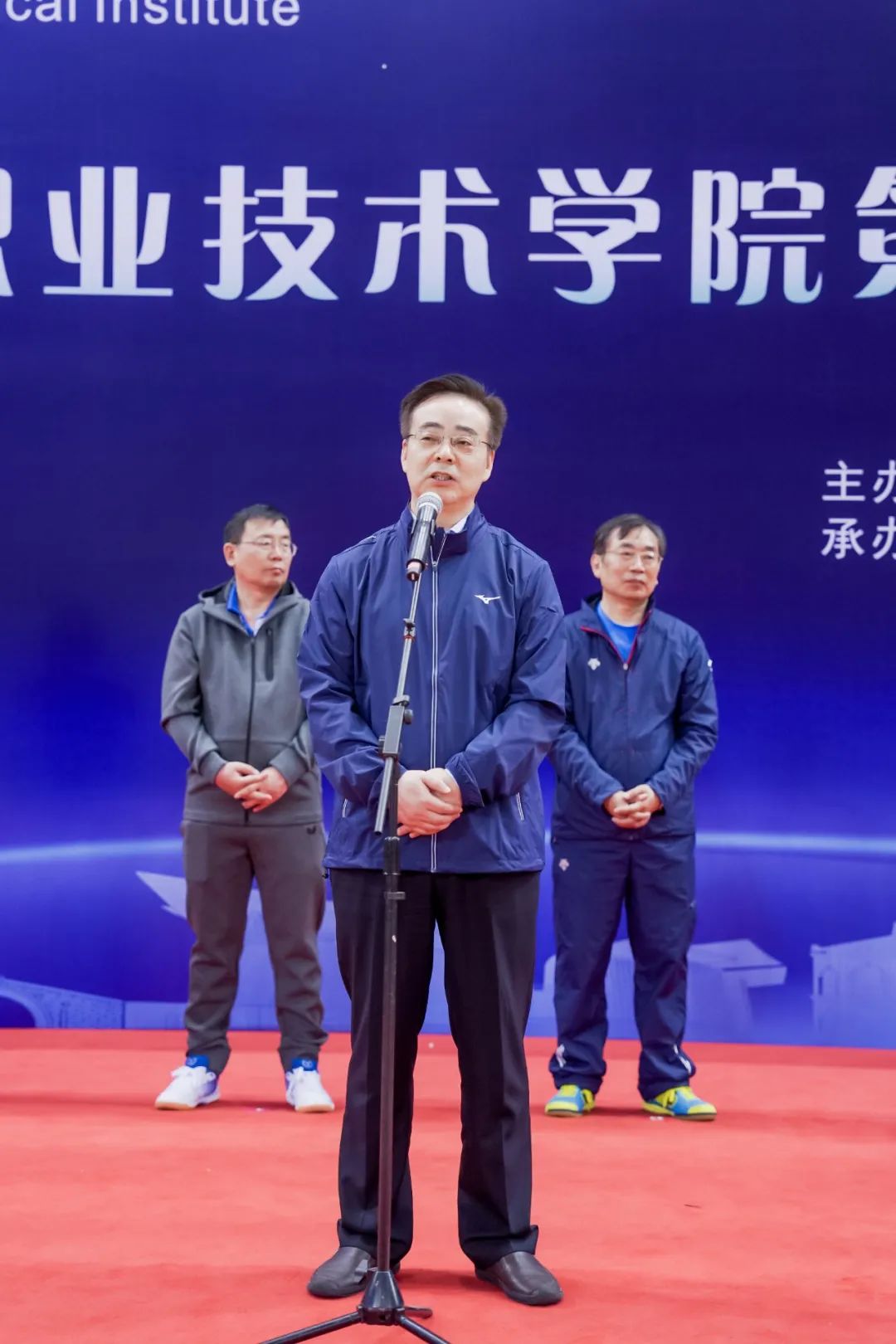 刘克勇代表大赛组委会对比赛的顺利举办表示热烈祝贺,对承办单位的辛勤付出表示感谢。近年来学院上下在党的全面领导下,事业发展稳中有进,内涵建设亮点纷呈,五年制高职取得长足发展。他希望本届“院长杯”乒乓球比赛能够充分展示各办学单位领导班子的活力,展示各位校领导的健康体魄和体育运动风采,提高各办学单位的凝聚力和向心力,助力各分院以更加饱满的热情推进江苏五年制高职高质量发展。