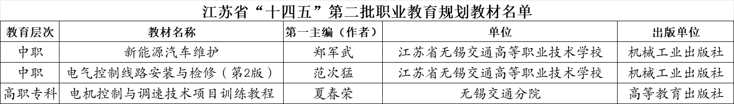 7月23日,江苏省教育厅公布的《省教育厅关于公布江苏省“十四五” 第二批职业教育规划教材名单的通知》中,我校《电机控制与调速技术项目训练教程》等3部教材成功入选。同时我校有6本教材获推送教育部参加第二批“十四五”职业教育国家规划教材评选。