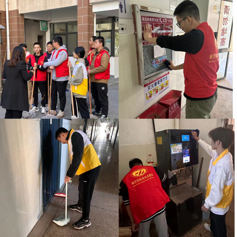 活动内容为打扫校园A栋和B栋,同学们共分为4组,每组10名成员,活动内容主要分为扫地、拖地、擦消防栓、饮水机等。