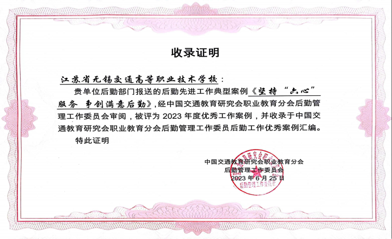 近日,中国交通教育研究会公布了2023年度后勤工作优秀案例评选结果。学校后勤管理处提交的《坚持“六心”服务 争创满意后勤》案例,从众多参评案例中脱颖而出,被评为本年度的优秀工作案例,并正式收录入中国交通教育研究会职业教育分会后勤管理工作委员会的后勤工作优秀案例汇编。