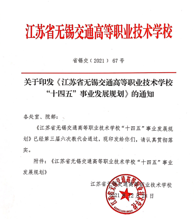 《江苏省无锡交通高等职业技术学校“十四五”事业发展规划》经学校第三届六次教代会审议通过,正式印发实施。这是学校党委深入学习贯彻习近平总书记关于“十四五”规划编制工作系列重要讲话精神、全面贯彻落实党的十九届六中全会和省政府《江苏省关于加快推进职业教育现代化的若干意见》等精神的具体行动,是学校党委充分发挥领导核心作用,抓好谋篇布局、把握发展方向、决定重大问题的生动实践。