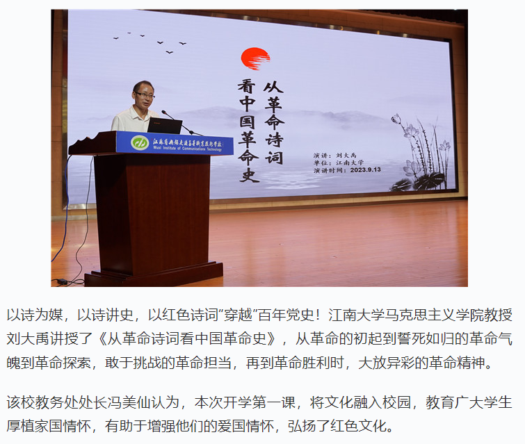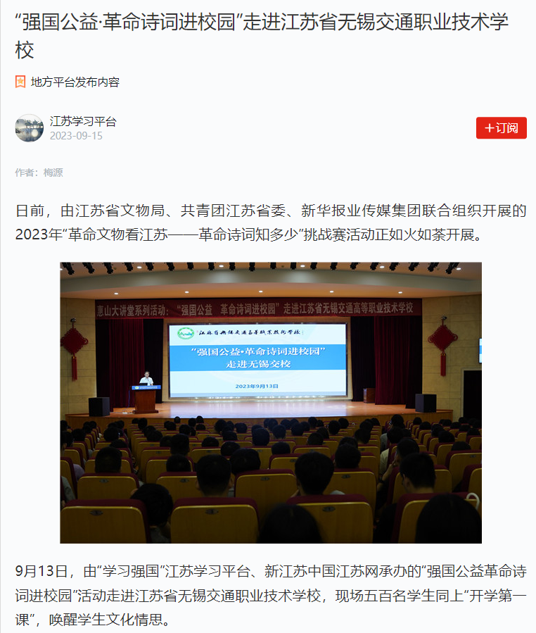 学习强国江苏学习平台:“强国公益·革命诗词进校园”走进江苏省无锡交通职业技术学校