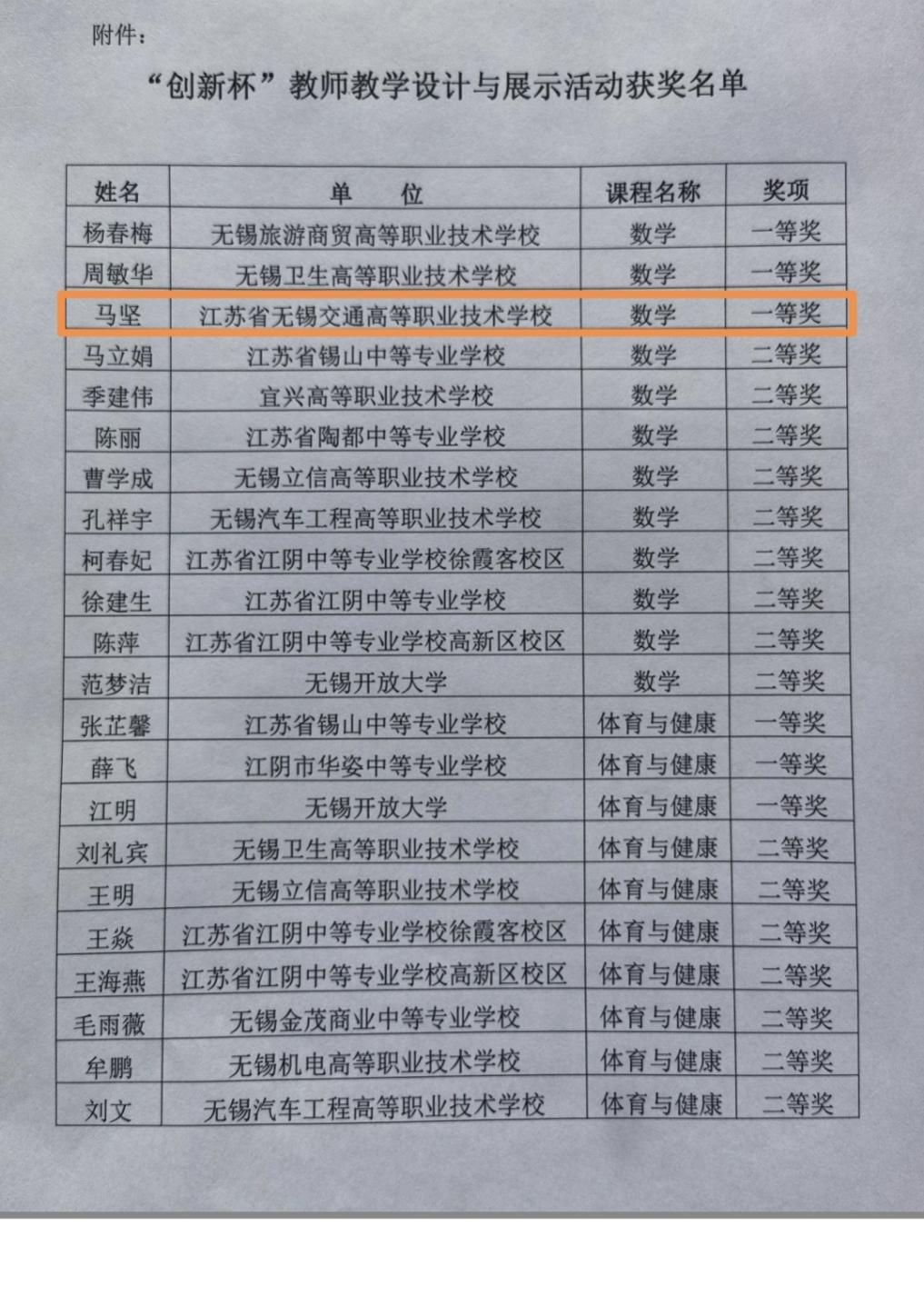 近日,无锡市教育科学研究院公布了2023年度无锡市职业学校“创新杯”教师教学设计与展示活动的结果。基础教学部马坚老师荣获一等奖。