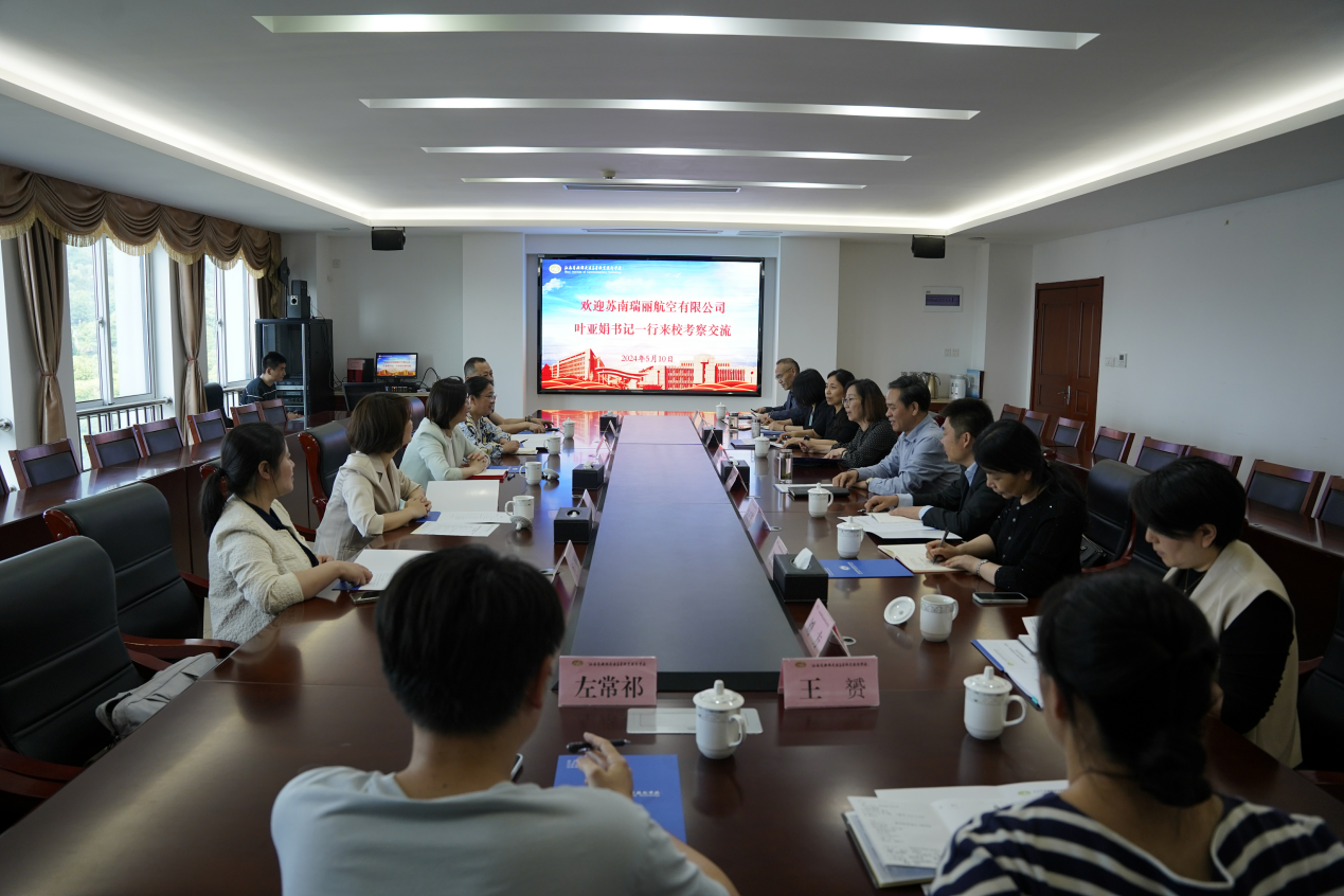 5月10日,苏南瑞丽航空有限公司党委书记、董事长叶亚娟一行莅临我校,就校企合作、产教融合等议题进行了深入的交流洽谈。会议在学校南校园致远楼512会议室举行,学校党委副书记、五级职员朱雨兰出席并主持会议。
