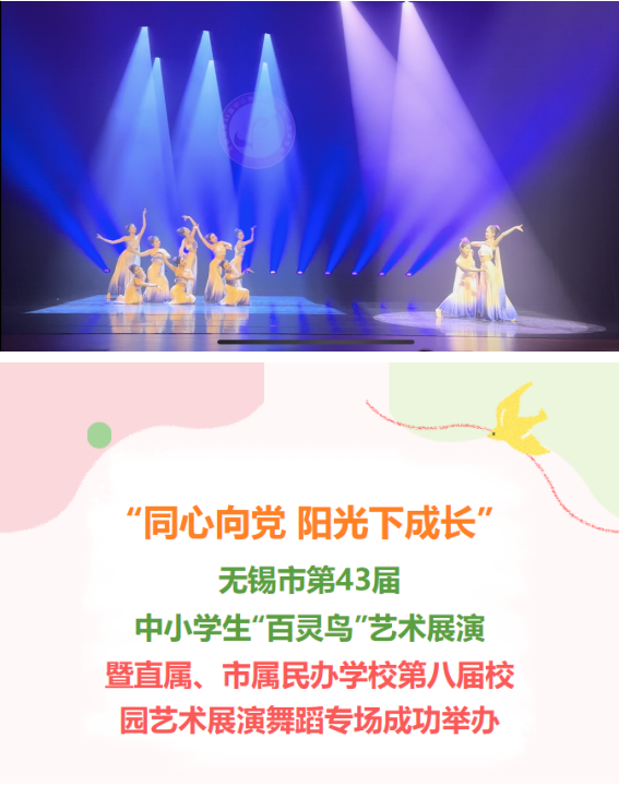 2024年无锡市第43届中小学生“百灵鸟”艺术展演暨直属、市属民办学校第八届校园艺术展于5月14日在无锡青少年宫举行。经过精彩的表演和激烈的角逐,郭晓琳、王涛老师指导的课本剧《喜被》荣获金奖,朗诵《先锋力量薪火相传》荣获银奖,杨格格老师指导的舞蹈《云之南》荣获银奖,展现了学校美育教育的丰硕成果和学生们的卓越才艺。