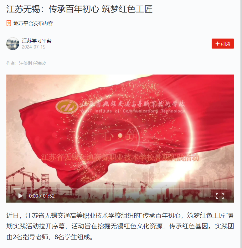 中江网:江苏省无锡交通高等职业技术学校组织“传承百年初心,筑梦红色工匠”暑期实践活动