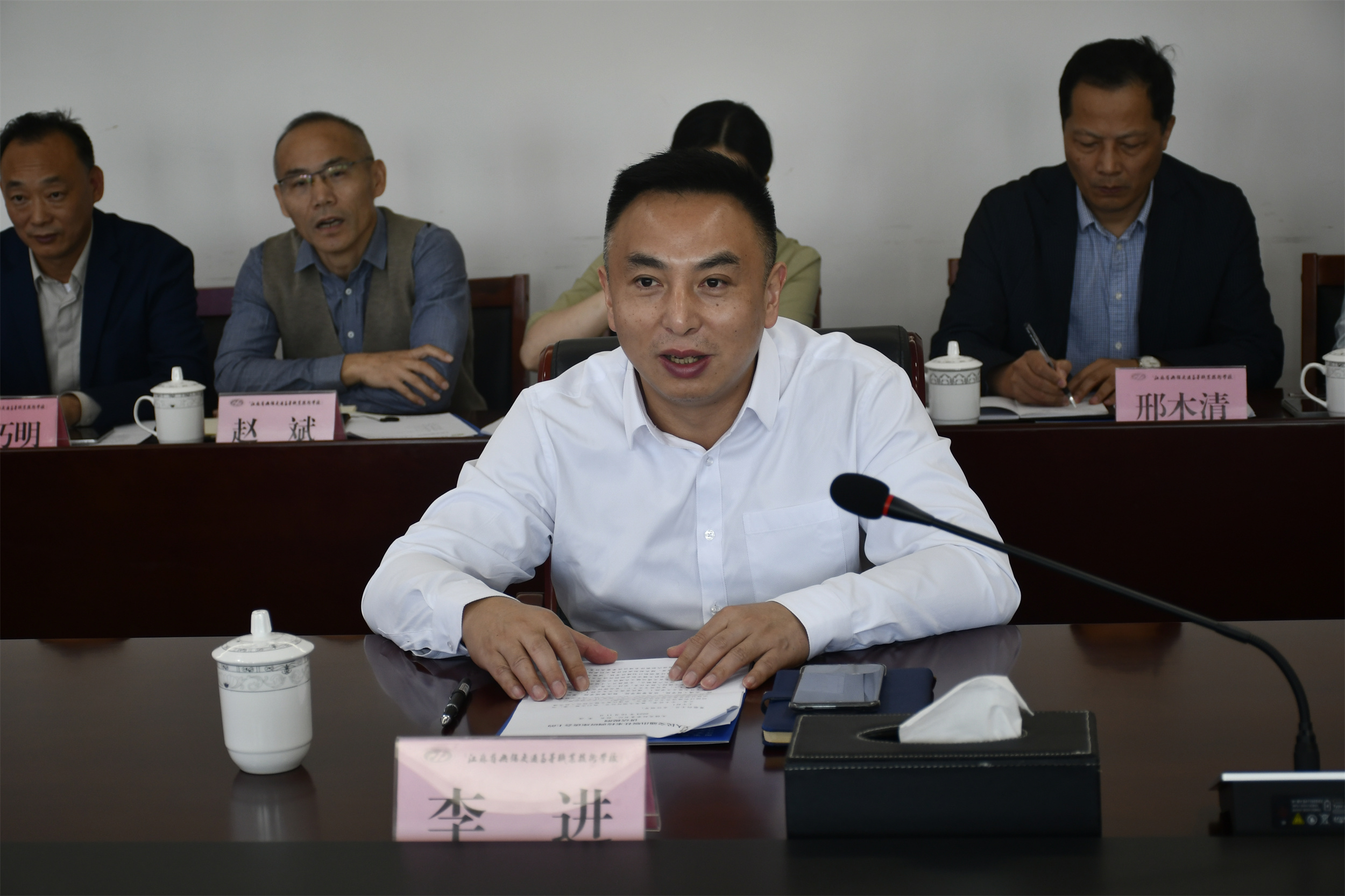 李进对王振军一行的到来表示欢迎,他介绍了学校的办学历史、发展现状、专业设置和教材开发等情况,对学校与人民交通出版社的合作表达了殷切期望,希望能够共同探索公共基础课、交通运输类教材建设的新模式、新路径。