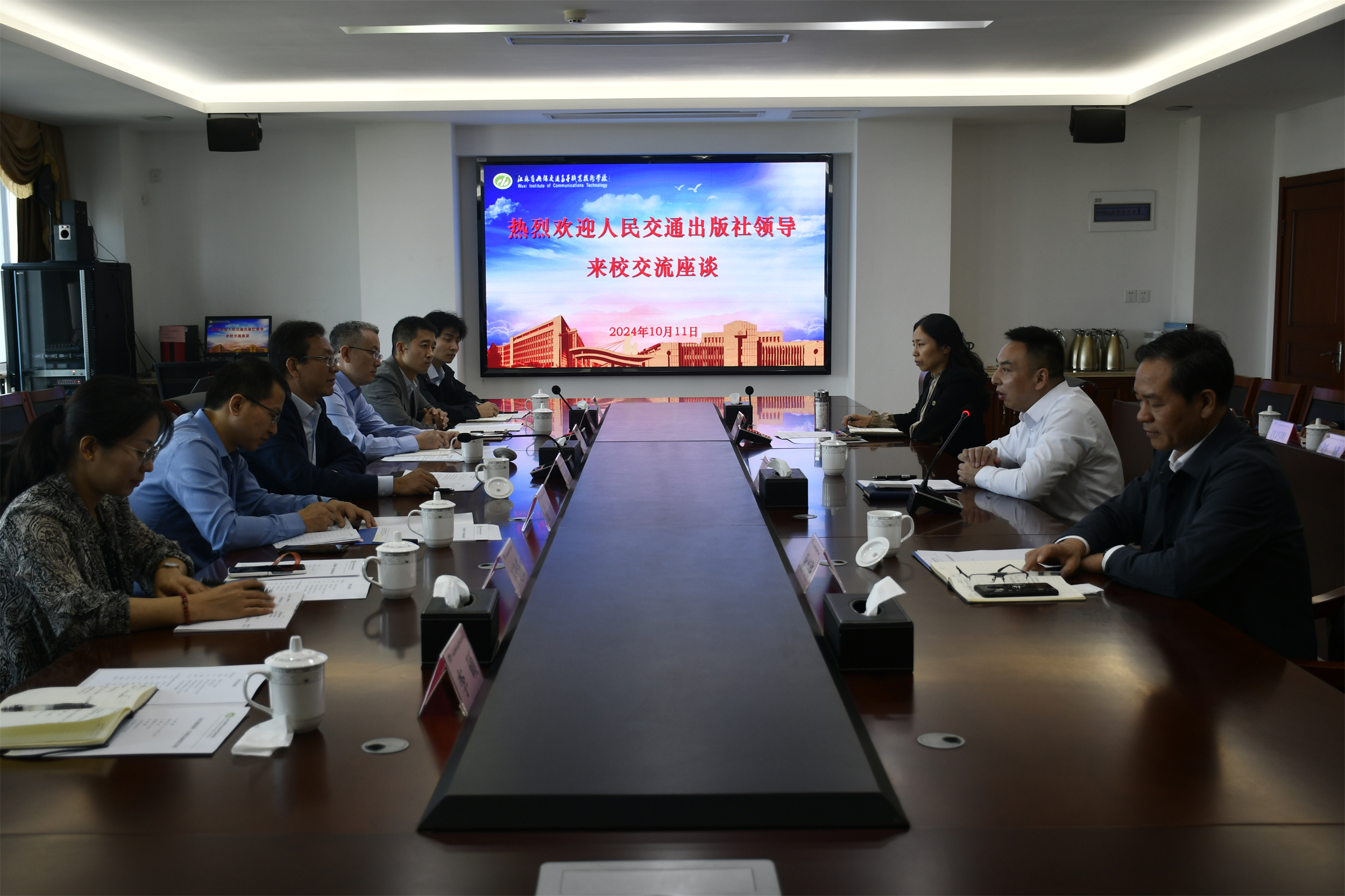 10月11日,人民交通出版社党委委员、副总经理王振军一行来校调研指导工作,学校党委书记、校长李进,党委委员、副校长耿兴华、吴雪琴接待了王振军一行。