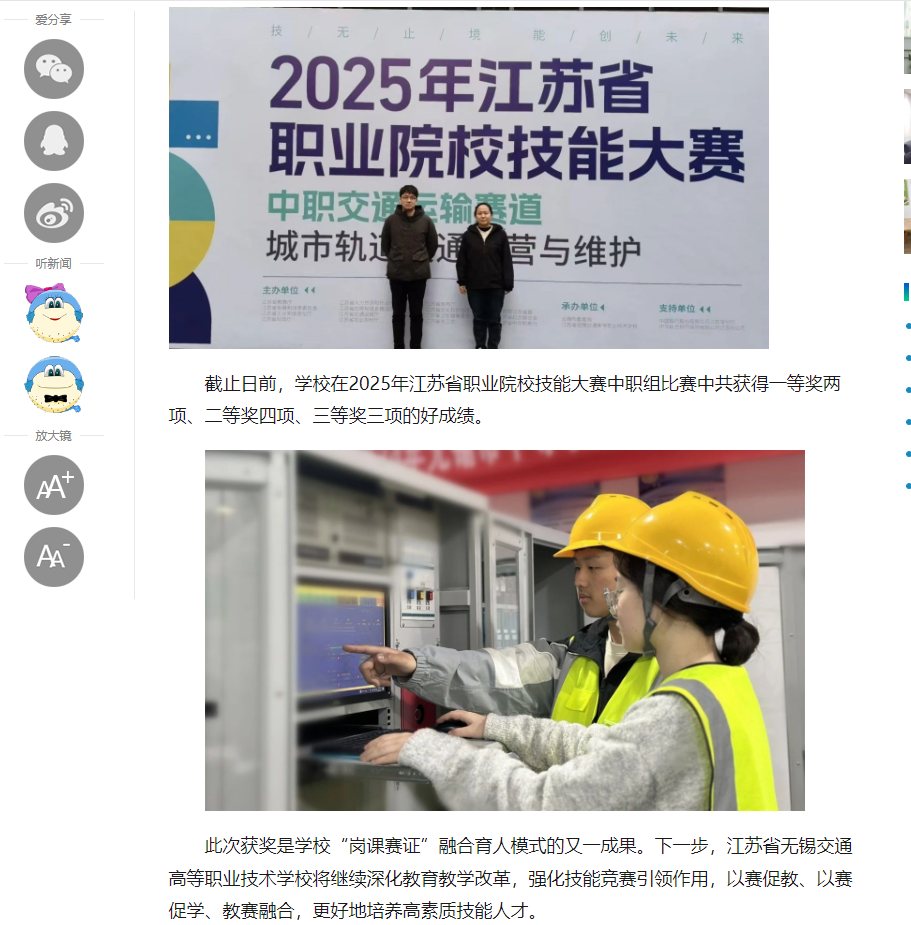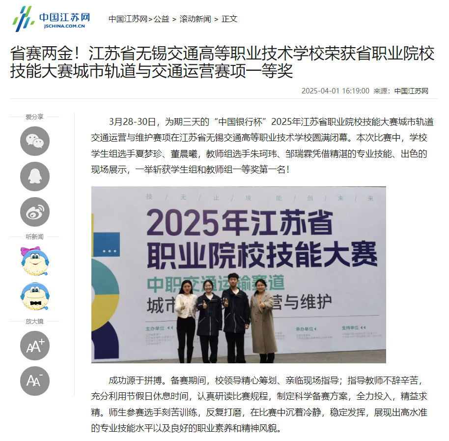 中江网:省赛两金!江苏省无锡交通高等职业技术学校荣获省职业院校技能大赛城市轨道与交通运营赛项一等奖