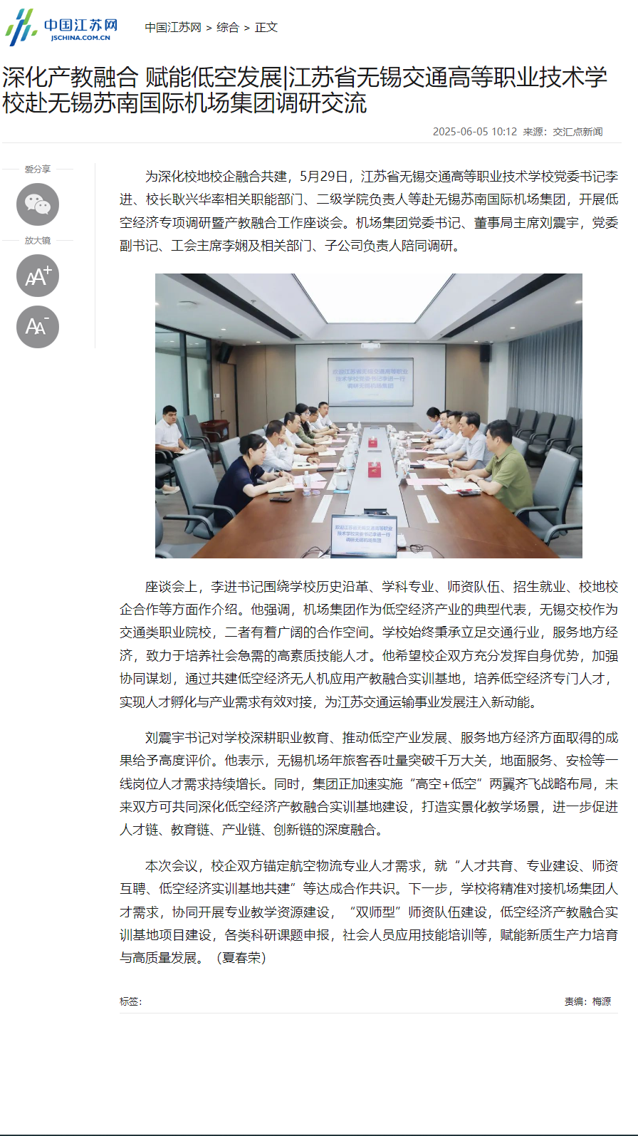 中江网:深化产教融合 赋能低空发展|江苏省无锡交通高等职业技术学校赴无锡苏南国际机场集团调研交流