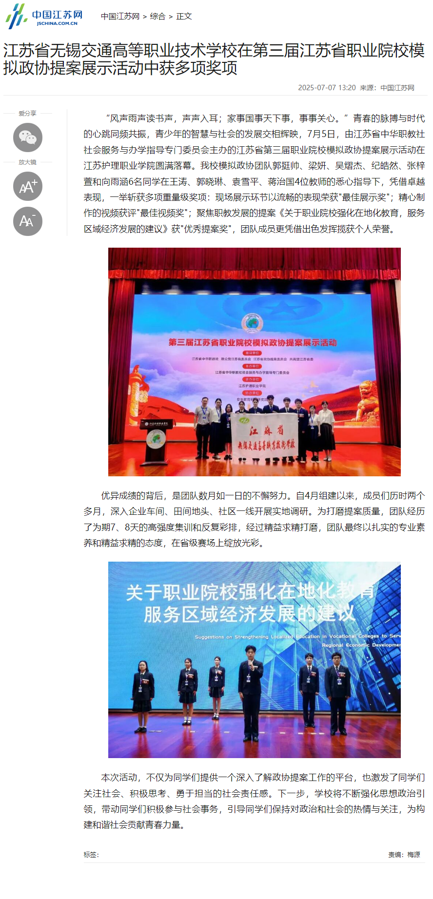 中江网:江苏省无锡交通高等职业技术学校在第三届江苏省职业院校模拟政协提案展示活动中获多项奖项