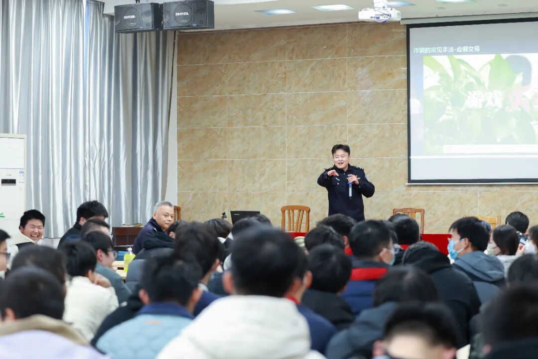 宣讲一开始,民警直击学生常见的自信心理,瞬间拉近距离。随后,课程聚焦于学生群体最易遭遇的诈骗类型:“刷单返利”“游戏账号交易” 等传统套路,以及利用AI技术实施诈骗的新型手段,逐一进行“技术流”拆解。