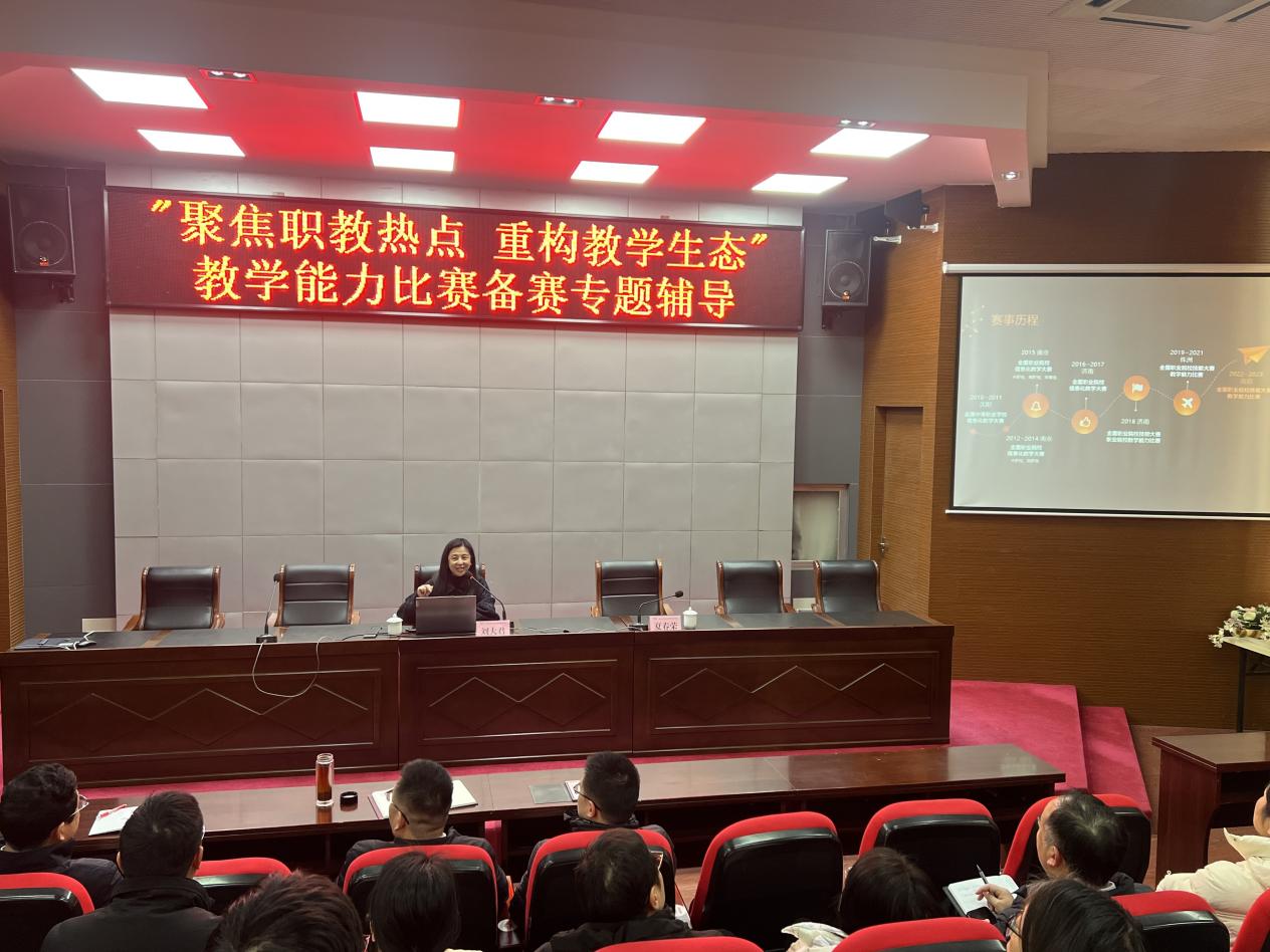 为深化教育教学改革,精准把握职教发展趋势,助力教师高效备赛教学能力比赛,122日,我校成功举办聚焦职教热点 重构教学生态备赛专题辅导活动。活动特邀江苏城乡建设职业学院设备工程学院院长刘大君教授主讲,全校各院部教学领导、参赛团队教师及各教研室教师代表齐聚,共探职教革新与备赛要点。