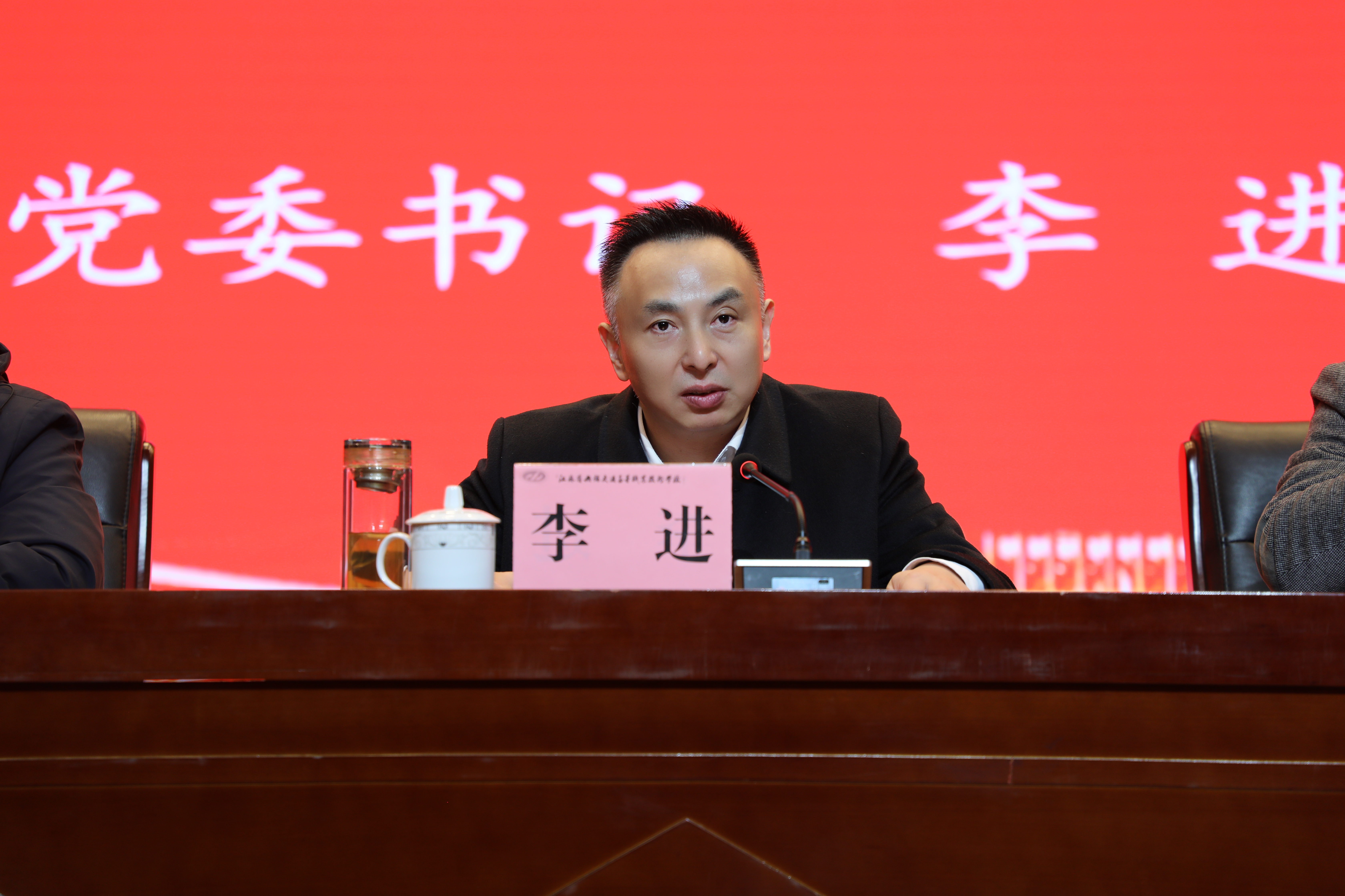 会上,党委书记李进讲话。他对学校2025年取得的丰硕成果表示充分肯定,向辛勤耕耘在教学、管理、服务等各条战线的教职工致以诚挚感谢和崇高敬意。李进点赞了教育教学、继续教育、学生管理、后勤服务等领域涌现出的先进典型与感人事迹,回应了去年领导班子民主生活会13条意见建议的整改落实情况。展望2026年,李进强调要秉承“不服输”的志气、积蓄“往前冲”的锐气、凝聚“暖融融”的人气继续“闯”出新天地。