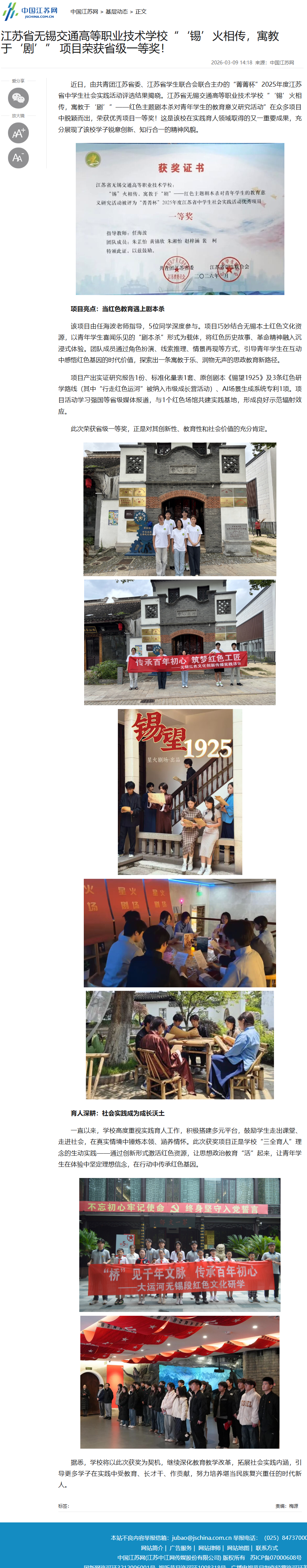 中江网:江苏省无锡交通高等职业技术学校“‘锡’火相传,寓教于‘剧’” 项目荣获省级一等奖!