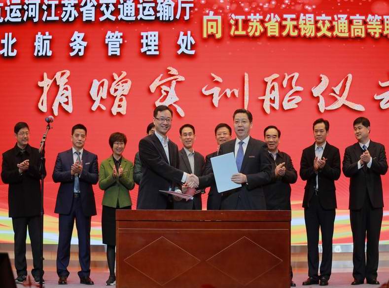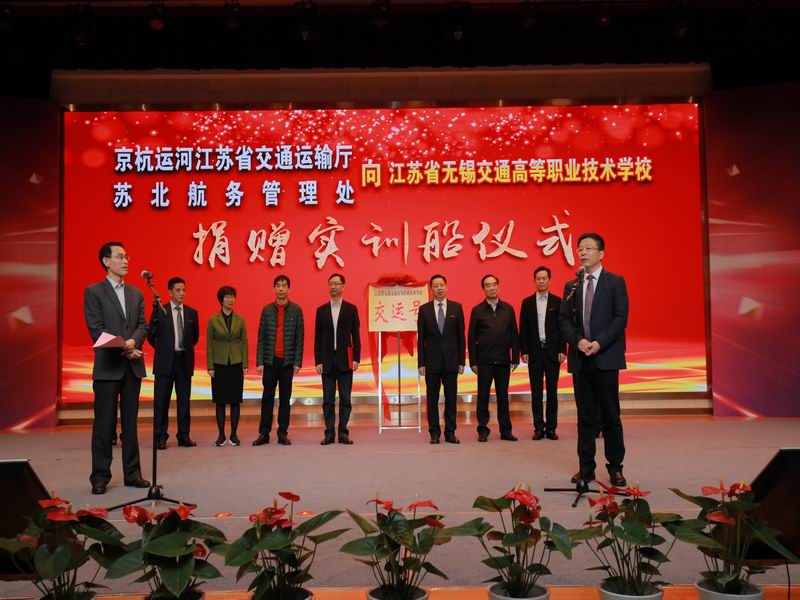 在学校六十年华诞之际,省苏北航务管理处向学校捐赠一艘实训船。2018年11月18日下午,在学校大礼堂举行实训船捐赠仪式。江苏省交通运输厅副厅长金凌出席捐赠仪式,为新船名揭牌并作重要讲话。省苏北航务管理处党委书记周进,龙寅生副处长 ,无锡市地方海事局副局长黄怡忠,全体校领导、部分师生代表参加了损赠仪式,仪式由陆春其校长主持。