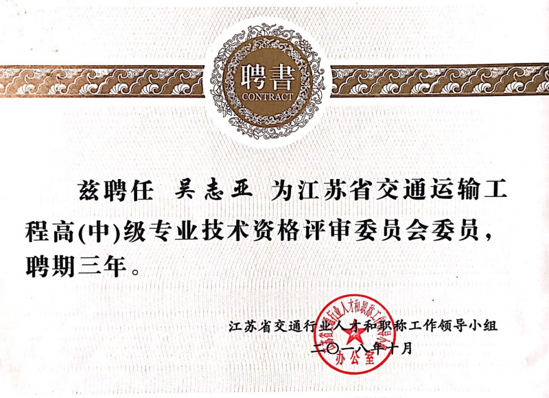 江苏省交通运输工程高(中)级专业技术资格评审委员会委员;