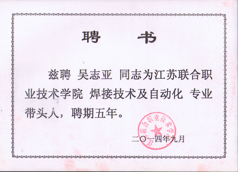 江苏联合职业技术学院焊接技术及自动化专业带头人