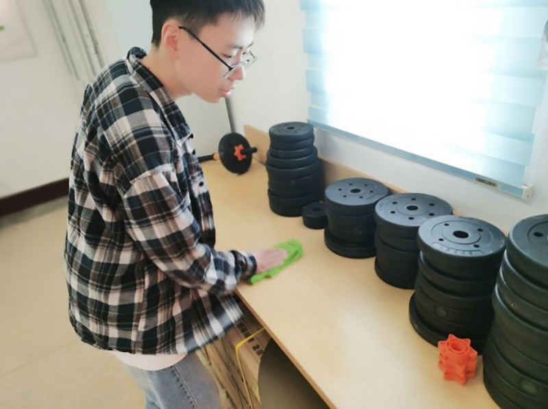 在此次志愿服务活动中,同学们在劳动委员李昊的带领下发扬一不怕苦,二不怕累的精神,手拿抹布、扫把等卫生工具,有条不紊地对健身房活动中心进行清扫。经过一上午的劳动,活动中心焕然一新,窗明几净,地面、桌子、健身器材都一尘不染、井然有序的摆放着。