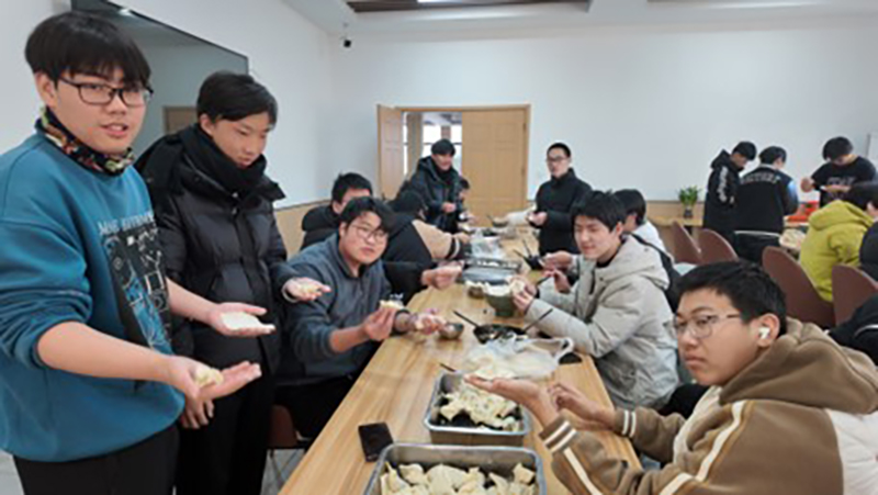 期间,热心的食堂阿姨也来到同学们中间,为大家展示了标准的包饺子手法,从取馅量的控制到捏褶的技巧,讲解细致、示范到位,让同学们受益匪浅。遇到不会包的同学,食堂阿姨和熟练的同学都主动上前指导,手把手传授技巧,充分展现了互帮互助的温暖氛围。班主任也来到活动现场,与同学们一同参与包饺子,不时叮嘱大家注意卫生,还和同学们畅谈新年规划,现场温馨融洽。