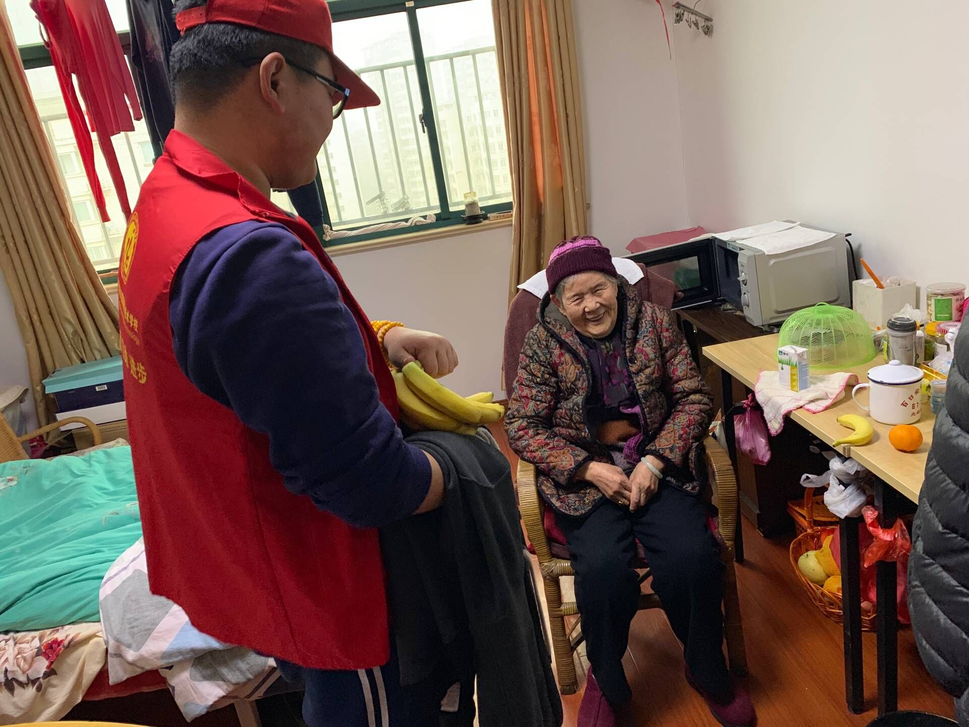下午两点,协会负责人带领10名志愿者走进了无锡新惠家园亲和一家敬老院,开展了关爱老人的活动。志愿者们事先为老人买了些水果,通过分发水果的方式来表达对老人的关心;老人们看到志愿者的到来感到格外的开心,热情的和志愿者展开了交流。志愿者们主动询问老人的生活情况,并帮老人打理内务。老人们十分感谢志愿者们的付出,并不停称赞他们是活雷锋。志愿者们也很投入的进行聊天,并承诺老人会常来这里看望他们。随着时间的流逝,老人开始进餐了,志愿活动也接近了尾声,在老人的叮嘱声中,志愿者们和老人依依不舍的挥手告别。