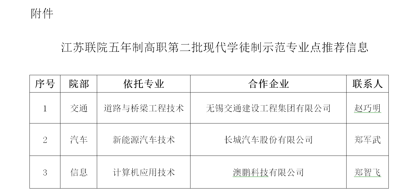 根据江苏联合职业技术学院《关于开展五年制高职第二批现代学徒制示范专业点申报工作的通知》(苏联院教〔2024〕19号),经各学院推荐,学校评审,并报校领导同意,拟推荐道路与桥梁工程技术、新能源汽车技术和计算机应用技术3个专业申报江苏联院现代学徒制示范专业点。
