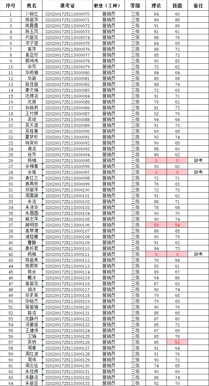 2025年11月30日,64名企业人员参加营销员三级技能等级认定考试(考试批次:2025-32020017-00046),共计59名成绩获得合格。现将考试成绩公示如下:
