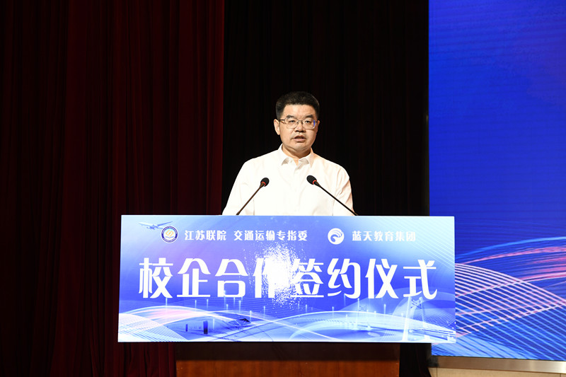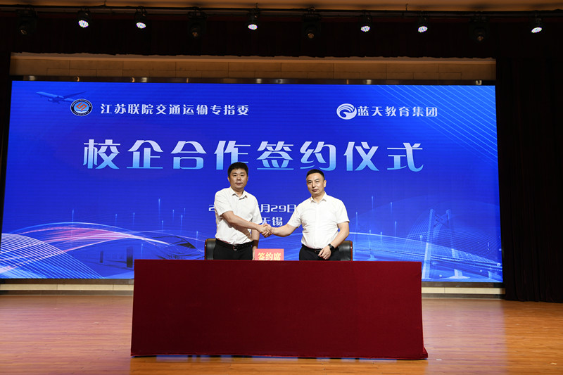 5月29日,江苏联合职业技术学院交通运输专业建设指导委员会与南京蓝天集团有限公司校企合作签约仪式在学校举行。江苏联院党委副书记、院长王伟、副院长金玉,学校党委书记、校长李进,南京蓝天教育集团有限公司董事长朱正华出席签约仪式。仪式由学校党委委员、副校长耿兴华主持。