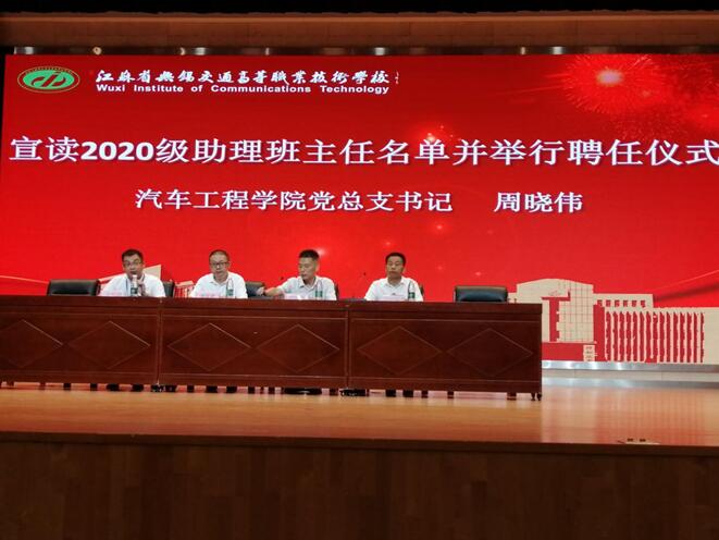 首先,全体师生、教官起立,齐唱国歌,展现了汽车工程学院全体师生昂扬向上、拼搏进取的精神风貌。接着,观看了学校宣传视频和学院招生宣传视频。随后周晓伟书记宣读了助理班主任名单,并举行聘任仪式;石松伟老师代表新生班主任发言,201531班徐阳同学代表新生发言,学院学生会主席、171511班付豪代表老生发言;金传琦副院长对20级新生进行入学教育。郑军武院长代表学院讲话,要求同学们一要端正学习态度,树立远大理想;二要培养良好的学习习惯,铸炼优秀的道德品质;三要学习勤奋刻苦,文化和技能素质全面提高;四要爱校如爱家,守纪并守法实现自己的理想和抱负!