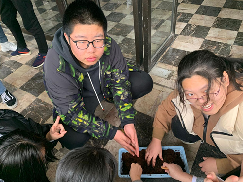 理论学习后,蔡晓静和郭晓琳一起带领社员开展劳动。此次小菜园计划涵盖土豆、胡萝卜、樱桃番茄、奶油生菜、白菜、香菜。蔡晓静老师向分好组的社员们分好劳动工具和种菜盆、并分配好蔬菜种子,一对一指导学生进行初步的培土和育苗工作。