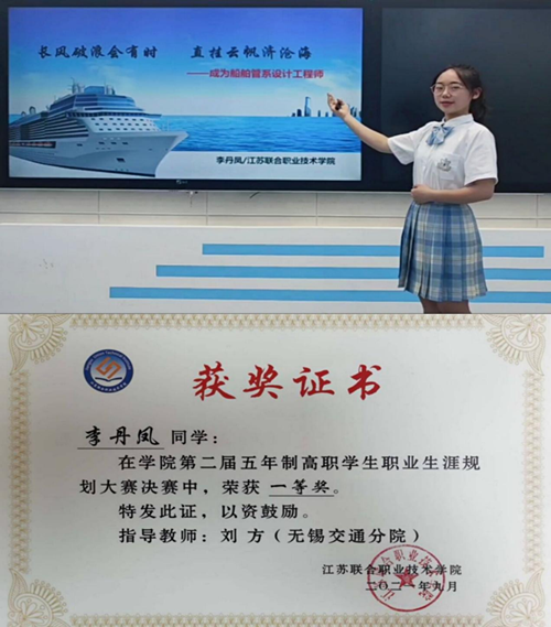 她担任着学院181121(41)班团支部书记,充分发挥新时代勇于创业、敢于创新、善于创优的“三创”精神,积极参加学校的各类活动,2021年9月,在江苏联合职业技术学院第二届五年制高职学生职业生涯规划决赛中,荣获一等奖。