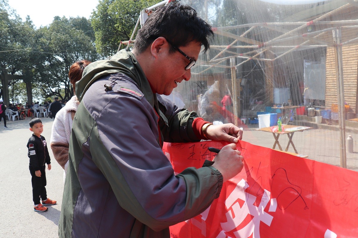 到达山顶后,我们的志愿者一起拉起了横幅,志愿者们先纷纷在横幅上签字,并邀请来往游客在印有“保护大自然,垃圾带下山”的横幅上签字进行环保宣传。