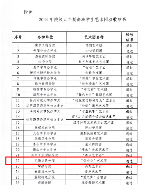 根据《关于开展2024年院级五年制高职学生艺术团验收工作的通知》要求,经组织专家查看材料、听取汇报和现场答辩等综合评定,我校“锡小交”艺术团顺利通过江苏联合职业技术学院五年制高职学生艺术团评审验收。