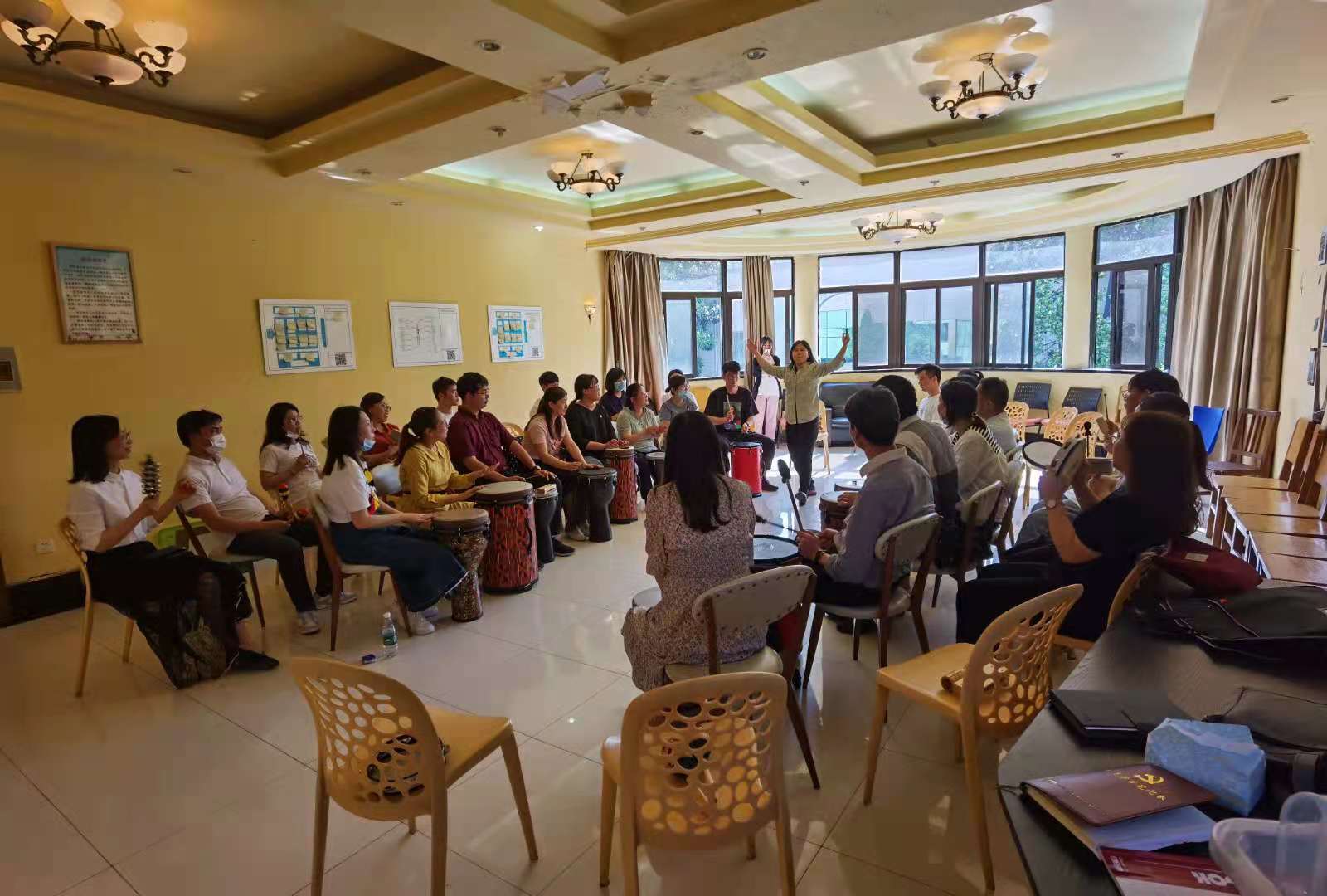 活动伊始,张一楠老师首先带领大家进行“鼓的召唤”热身活动,随后她向大家简单介绍了鼓圈的相关知识及乐器的击打方式。接下来,她带领大家进行了鼓圈减压体验。老师站在圈中来回走动,用手中的器具,语言和肢体动作发出指令,大家跟随指令动作,敲击乐器发出不同的节奏,每个人都可以随时打出自己的节奏,也可以加入别人的节奏。现场效果十分热烈,共同击打出一段段振奋人心的打击交响曲。