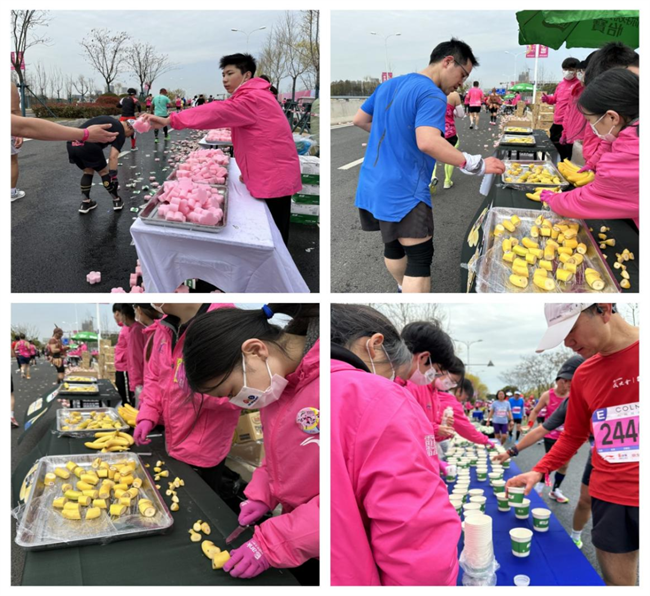 在比赛白热化的后半段路程,志愿者们不停歇的为马拉松跑者们提供饮水、食物、补给海绵……即使双手被冻得通红,依然饱含热情为跑者们呼喊,为他们加油打气!
