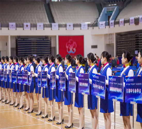 指引组主要由学校船舶工程学院航空服务专业80名学生担任,他们身着天空蓝制服,在赛场入口指引参赛队员入场、在开幕式现场举起手举牌为参赛队伍定位、在道路旁为参赛人员引路……成为乒乓球赛场的蓝色风景线。