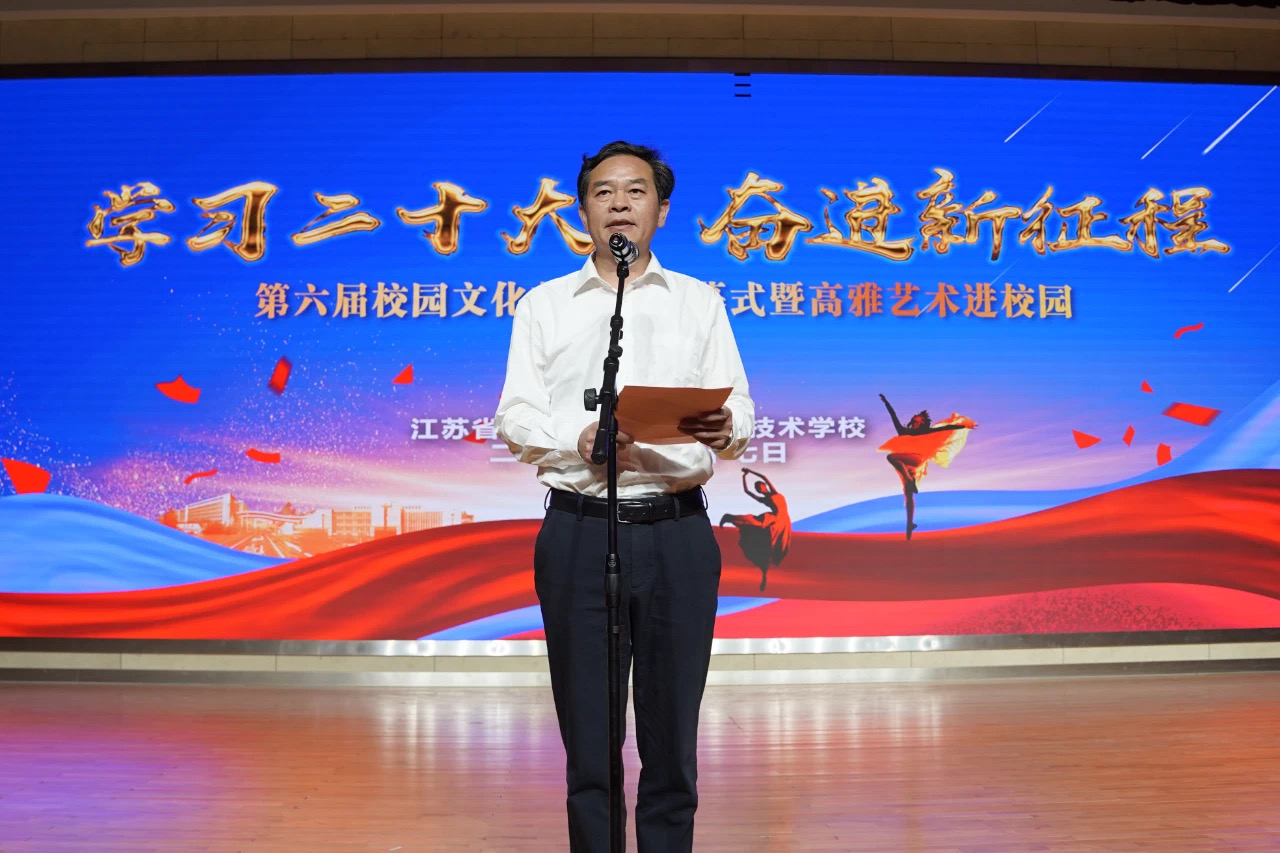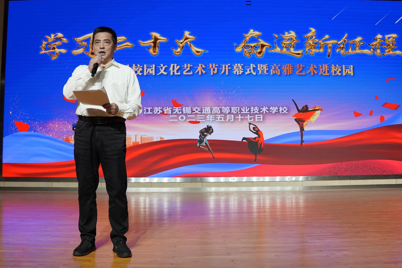 为进一步学习贯彻党的二十大精神,加强校园文化建设,营造积极健康、高雅文明的校园人文环境。5月17日,学校第六届校园文化艺术节开幕式暨高雅艺术进校园活动隆重举行。江苏省交通运输厅团委书记钱京江,校党委书记、校长李虎,校党委委员、副校长耿兴华、校纪委书记邢勇、副校长范次猛出席此次活动。开幕式由校党委委员、副校长倪依纯主持。