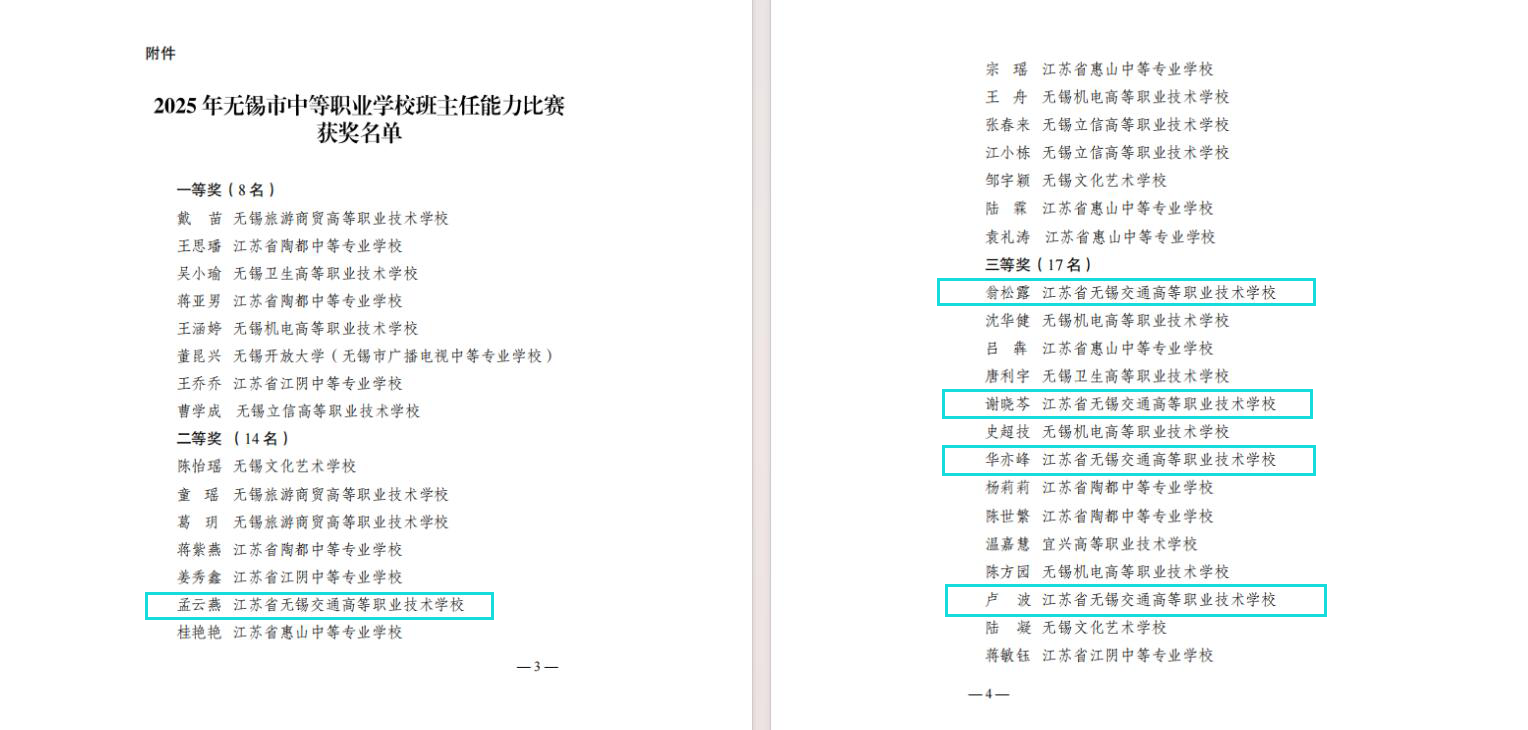 在刚刚落幕的2025年无锡市中等职业学校班主任能力比赛中,经过激烈角逐,学校参赛教师表现优异,5名教师全部获奖,其中1名教师获得二等奖,4名教师获得三等奖。展现了学校班主任队伍过硬的专业素养和育人水平,为学校赢得了荣誉。
