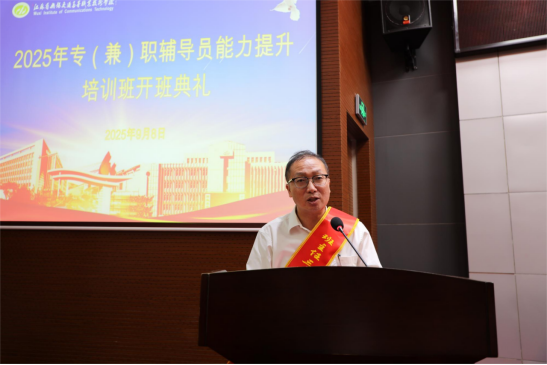 为全面提升学生工作队伍的业务能力和综合素养,帮助专(兼)职辅导员更好地适应新时代学生工作的新要求,9月8日至9日学校成功举办了2025年专(兼)职辅导员能力提升培训班。学校党委委员、副校长吴雪琴出席开班典礼,各二级学院分管学生工作的领导、学工办主任、学工干事、2025级新生班专(兼)职辅导员80余人参训开班典礼由学生工作处处长、团委书记王光祥主持。