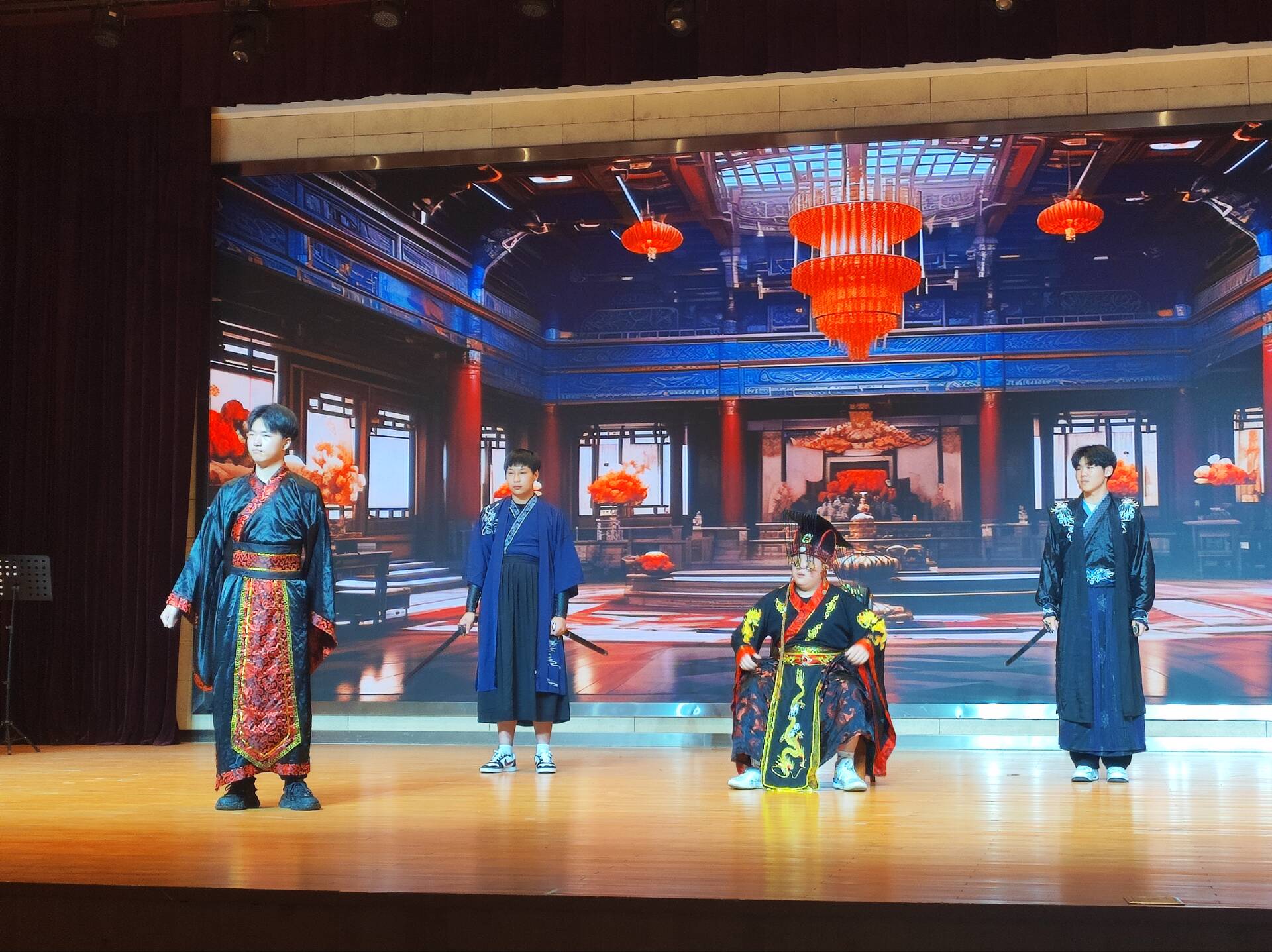 舞台上,学生们以精湛的表演技艺,生动地展现了课本中的文学作品。从《完璧归赵》的智慧与策略,到《烛之武退秦师》的机智与勇气;从《套中人》的讽刺与幽默,到《蒋干中计》的计谋与反转;再到《喜被》与《项链》的生活哲理与情感纠葛,深深打动了在场的每一位观众。